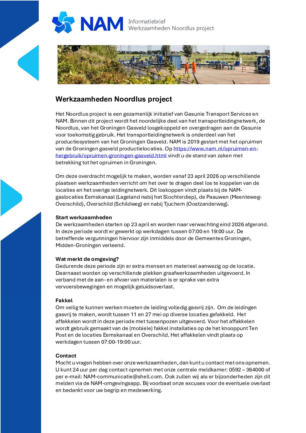 Mocht u vragen hebben over onze werkzaamheden, dan kunt u contact met ons opnemen. U kunt 24 uur per dag contact opnemen met onze centrale meldkamer: 0592 – 364000 of per e-mail: NAM-communicatie@shell.com. Ook zullen wij als er bijzonderheden zijn dit melden via de NAM-omgevingsapp. Bij voorbaat onze excuses voor de eventuele overlast en bedankt voor uw begrip en medewerking.